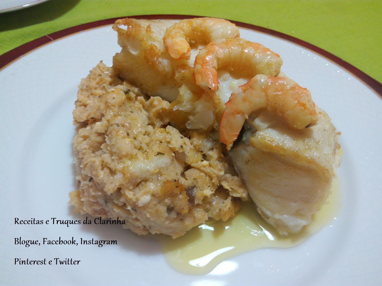 Sirva a açorda acompanhada dos lombos de bacalhau assados e os camarões grelhados.