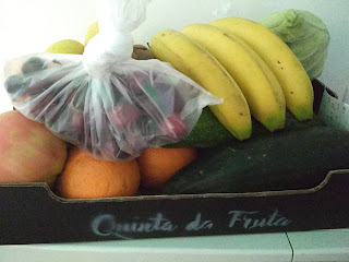 Como sabem antes comprava o cabaz na empresa da Quinta para a Mesa mas à mais de um mês que por motivos pessoais a empresa não está a fazer entregas de cabazes e eu não posso ficar sem legumes pois a sopa é aonde a maior parte dos miúdos vai comendo, os nutrientes dos legumes. Já estava a desistir até que encontrei esta "Quinta da Fruta", fica em Ermesinde e também trás os cabazes a casa/trabalho. Os cabazes custam 10,50 euros e traz 1 kg de batatas, 500 gramas de cebolas, 2 cenouras, 2 pepinos, 1 alface, 1 couve coração, 2 tomates, 1 kg de maçã, 1kg de laranja, 500 gramas de pêras, 500 gramas de kiwi, 500 gramas de banana e 50 gramas de cerejas. Podemos fazer a troca de 3 frutas ou legumes como entendermos e existe claro sempre outras coisas que podemos encomendar extra ao cabaz. A semana passada encomendei um molho de espinafres e 3 pimentos, ou não fosse São João.