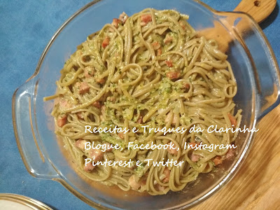 Bom dia, Ando um pouco cansada da comida e só me apetece comer duas coisas ou massa ou bacalhau. Não me puxa comer carne e pelo contrario, sempre que posso como peixe. Esta massa é uma das minhas preferidas mas acho que ando a abusar pois o meu Homem grande já disse que já não podia ver pesto à frente. 😰 É engraçado como o cansaço e a falta de tempo faz com que a gente caia nas rotinas e faça sempre a mesma coisa mas também é complicado cozinhar para casa e para os curiosos pois existe pouca coisa que comam, e sinceramente este é o meu prato de conforto nesta altura, sabe mesmo bem comer esta massinha assim tão verde. Espero que gostem!!! Aqui fica a receita!!! Linguine com molho pesto Linguine com molho pesto Linguine com molho pesto Linguine com molho pesto Ingredientes: 250 gramas de linguine com pesto 4 dentes de alho 1 chávena de manjericão frescos Aromáticas Vivas 1/2 chávena de azeite virgem Quinta da Sequeira 100 gramas d...
